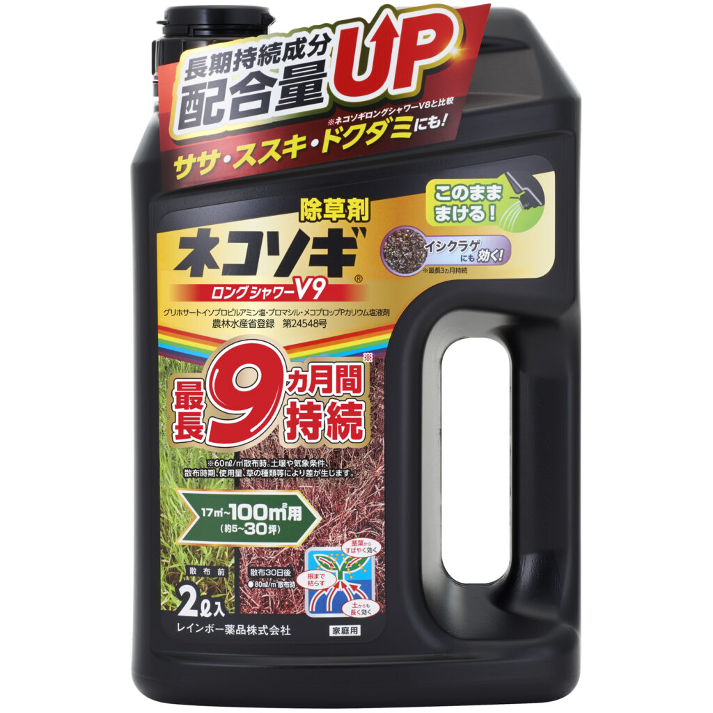 粒剤の特長と液剤の特長を併せ持った液体除草剤ネコソギロングシャワーV9があります。