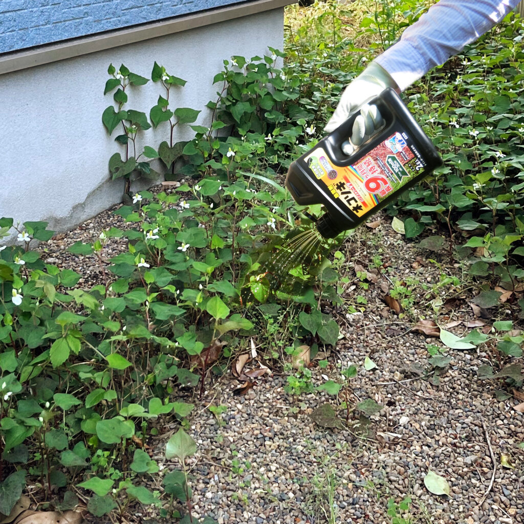 成分はその植物の中を移動して根までしっかり枯らし、土に落ちた薬液はすぐに除草剤としての働きが失われる仕組みです。