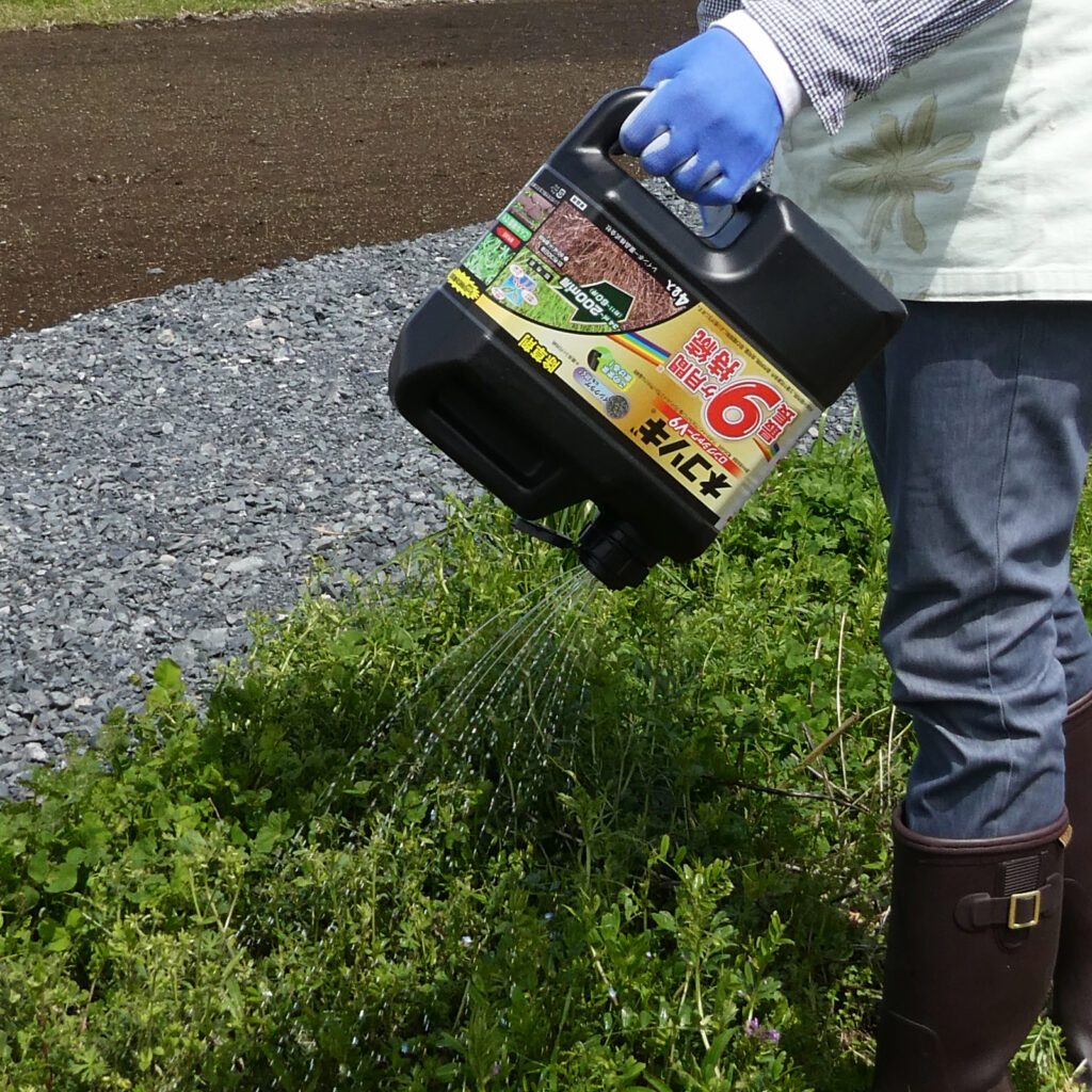 • 原液をそのまま、雑草の葉や茎が濡れるように散布します。長期間効かせたい場合には地面に十分量を散布する。