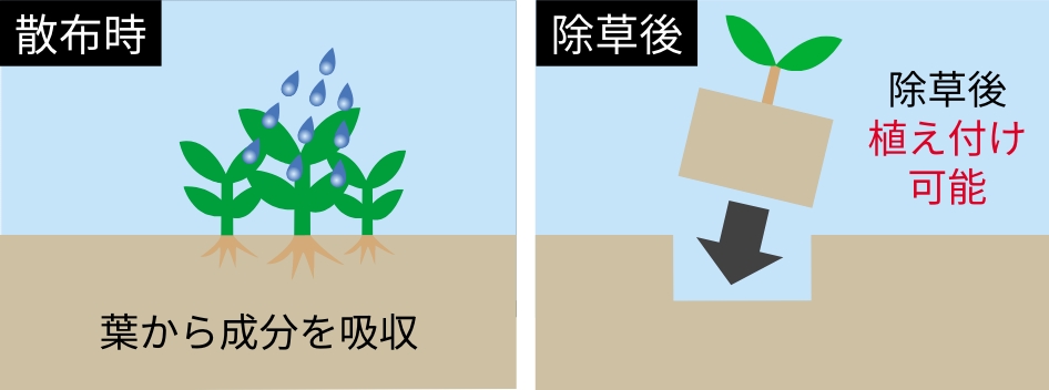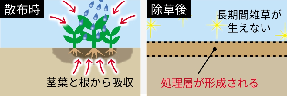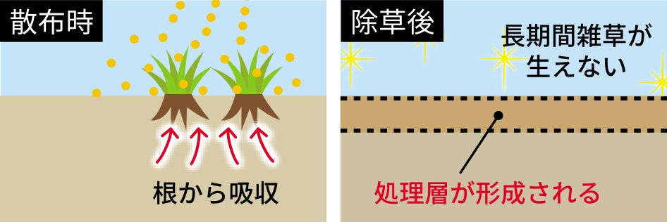 土壌処理型の除草剤は成分がいったん土壌に移行して、雑草の根から吸収され徐々に雑草を枯らします。それと共に、土壌に処理層を形成するので、長期間雑草の発生を抑えることができます。